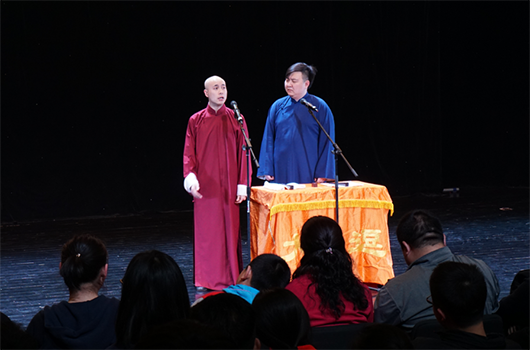 首先,青年相声演员孙宏超带来了快板书表演《旅途奇遇》,传奇而又正能量的故事配上快板的独特韵律,让台下的观众听得津津有味。第二个节目是李涵、迟永志带来的相声《青春修炼手册》,94年的“小鲜肉”逗哏和身材“肉乎乎”的捧哏组成“肉肉组合”给节目增添了不少欢乐。青年相声演员董建春、李丁此次为观众们带来的是作品《达芬奇往事》。两人一个戴着眼镜、一个露着板牙,不仅形象有特点,节奏快、包袱密、信息量大的表演也令人印象深刻,场内气氛热烈,观众不时发出哄堂大笑。第四个相声节目名为《黑猫警长》,表演逗哏的是相声界学历最高的演员李寅飞,表演捧哏的则是出身京剧世家、嗓子最好的相声演员叶蓬。最后,武启深、陈延龙上台奉上了相声表演《致青春》,勾起了台下观众无数青春回忆。